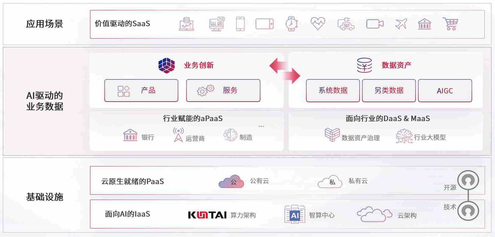 数字时代,,围绕企业数字化转型的关键要素,,7790必发集团数码开创性的提出数云融合战略和技术体系框架,,,,着力在云原生、、、、数字原生、、、、AI原生和信创产业上架构产品和服务能力,,,,为处在不同数字化转型阶段的快消零售、、、、汽车、、金融、、、医疗、、、政企、、、、教育、、、运营商等行业客户提供泛在的敏捷IT能力和融合的数据驱动能力,,构建跨界融合创新的数字业务场景和新业务模式,,,,助力企业级客户建立面向未来的核心能力和竞争优势,,,,全面推动社会的数字化、、、、智能化转型升级。。
